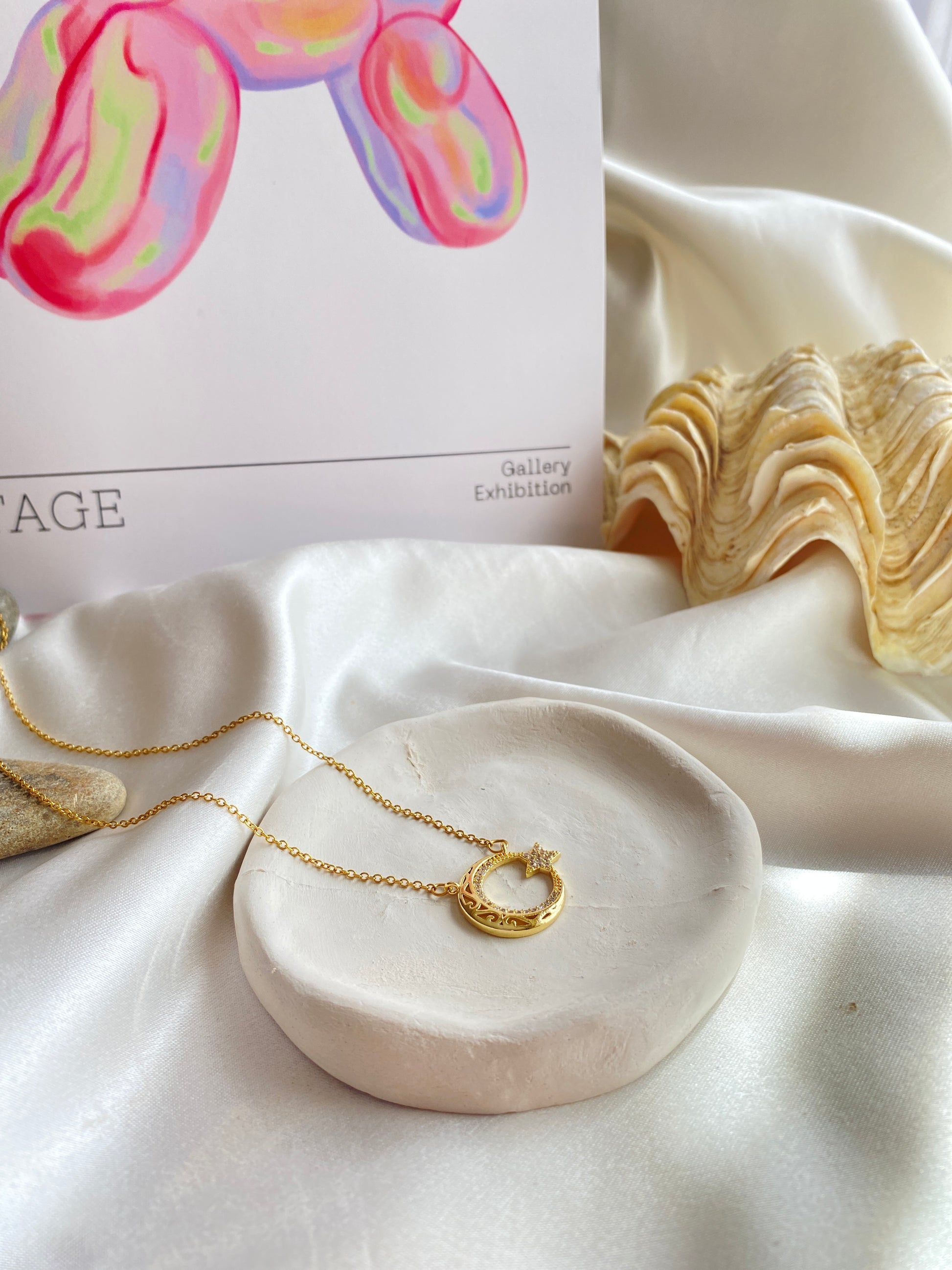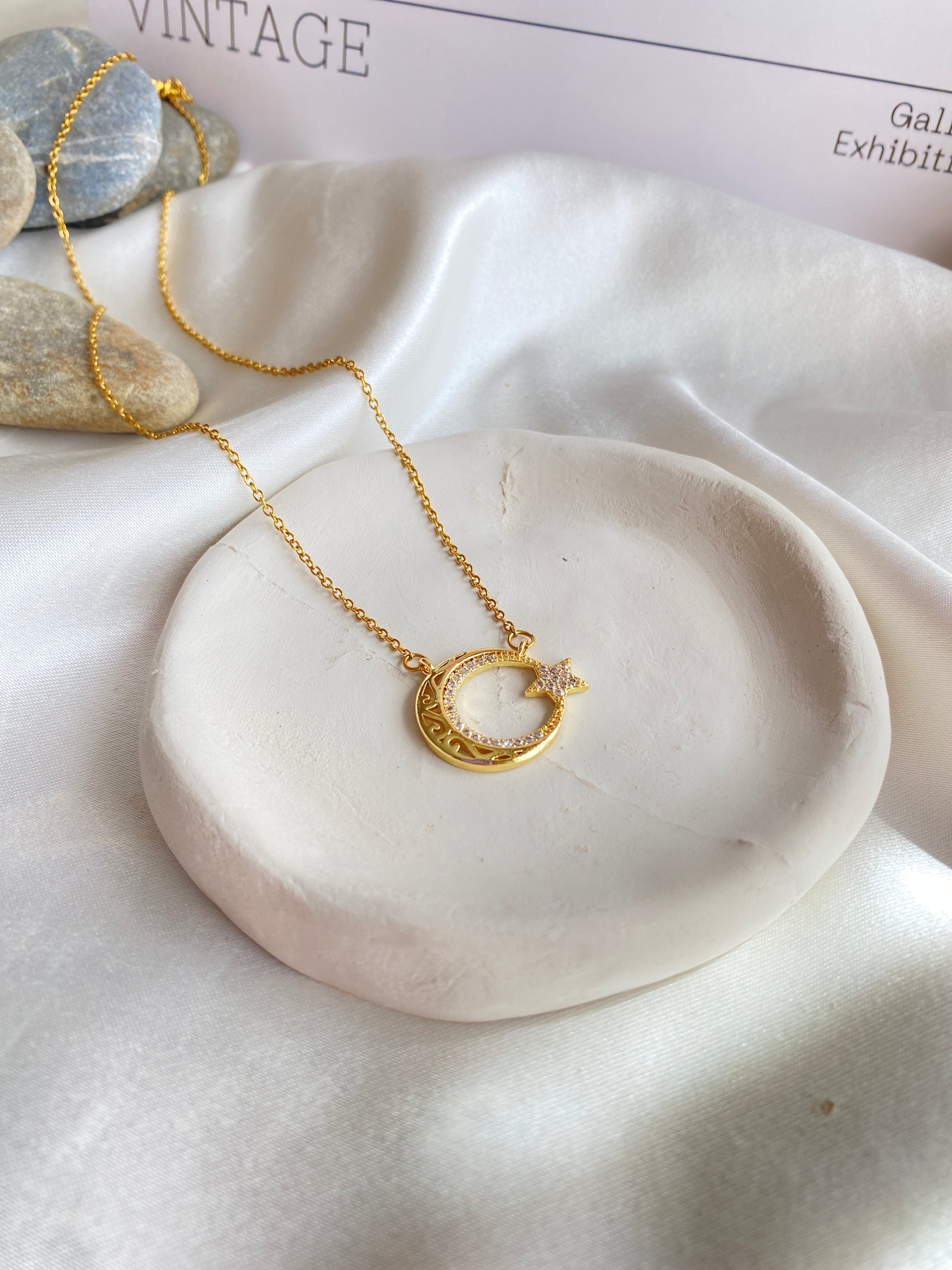Yıldız Taşlı İşlemeli Bayrak Gold Çelik Kolye